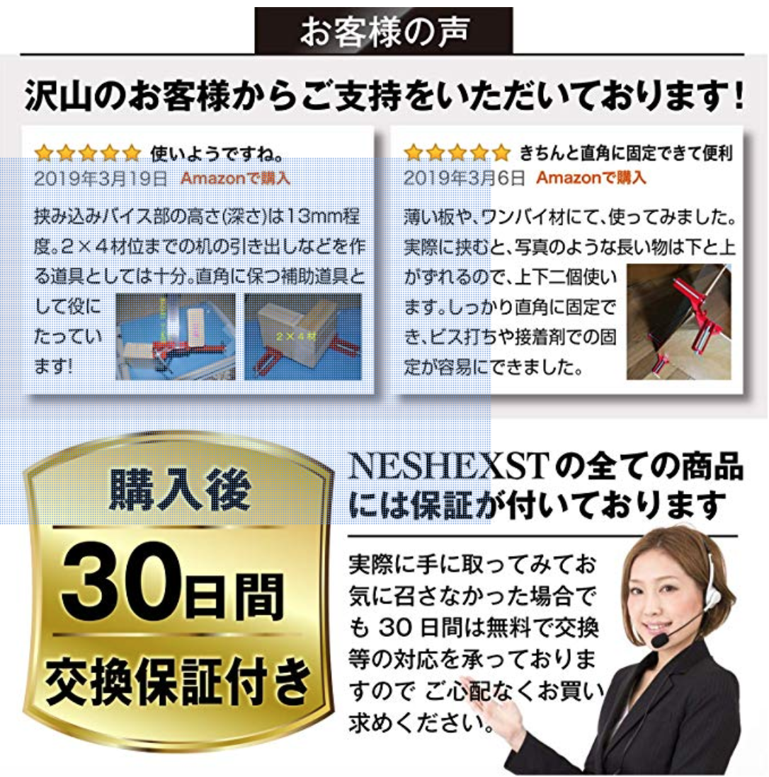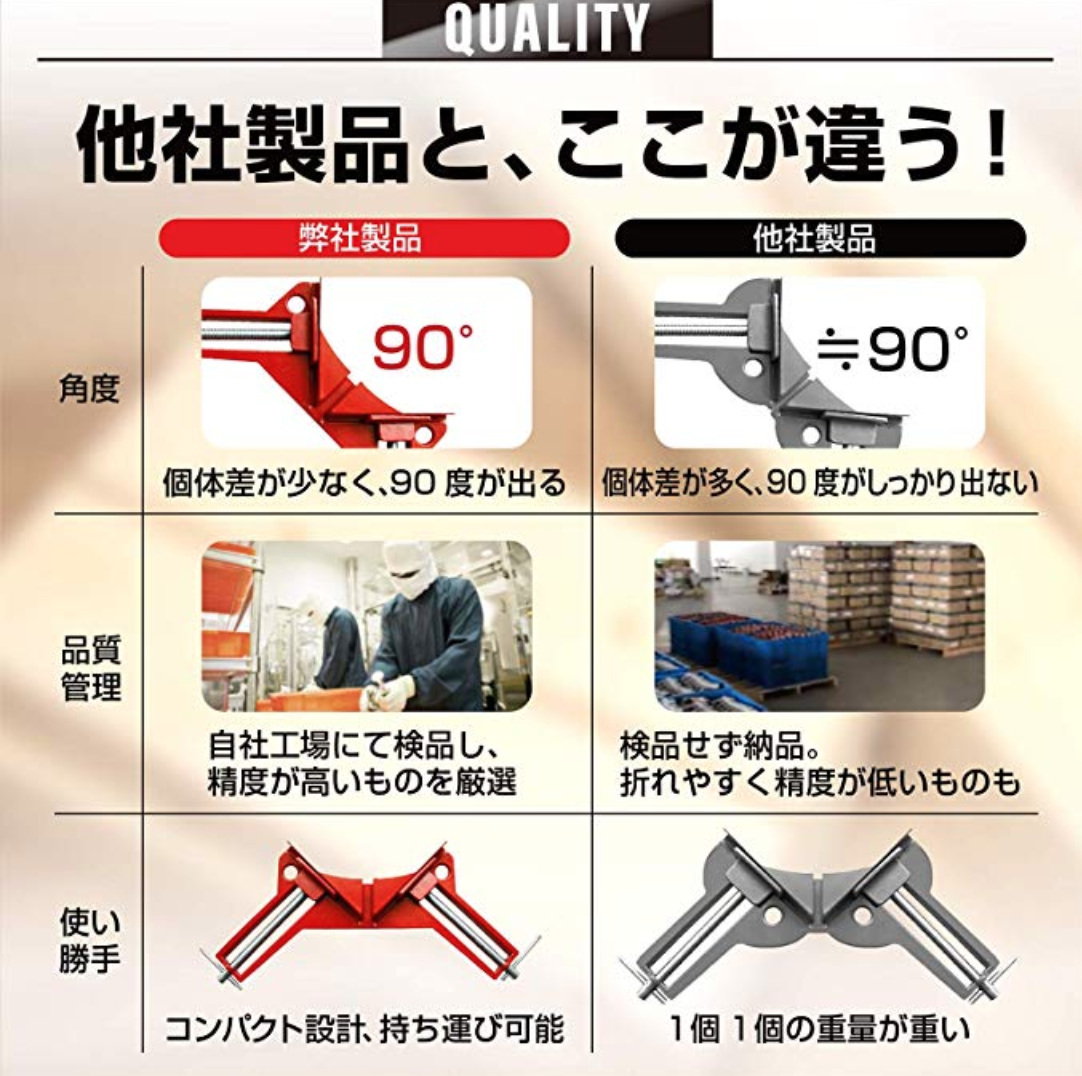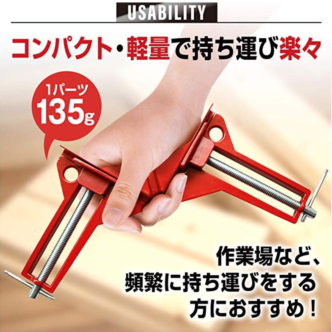 自社工場にて検品管理をしっかり行っているNESHEXSTのコーナークランプです。そのため個体差が少なく90度がしっかりでます。1パーツあたりの重量も135gと軽量で持ち運びにも便利なので、DIYでの使用はもちろん、プロの方など持ち運びを頻繁に行う方におすすめです。