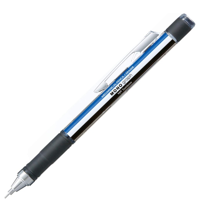 こちらは誰もが目にしたことがある青と白と黒の「MONO消しゴム」デザインのシャープペンです。消しゴムは軸の部分を回転させて長さを調整できます。また、シャーペンを振るだけで芯が出るフレノック機能を搭載しています。