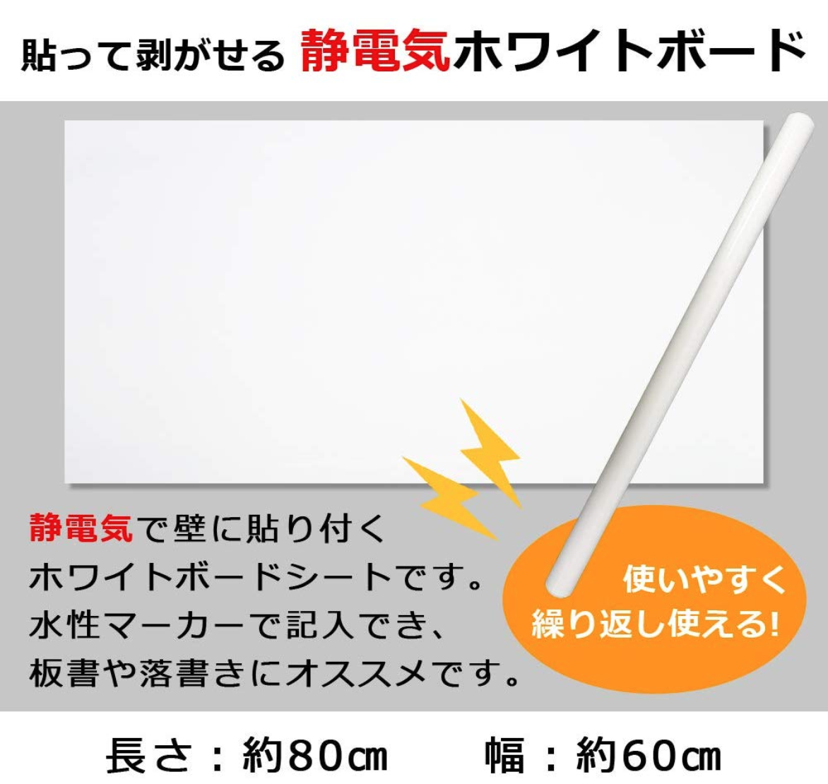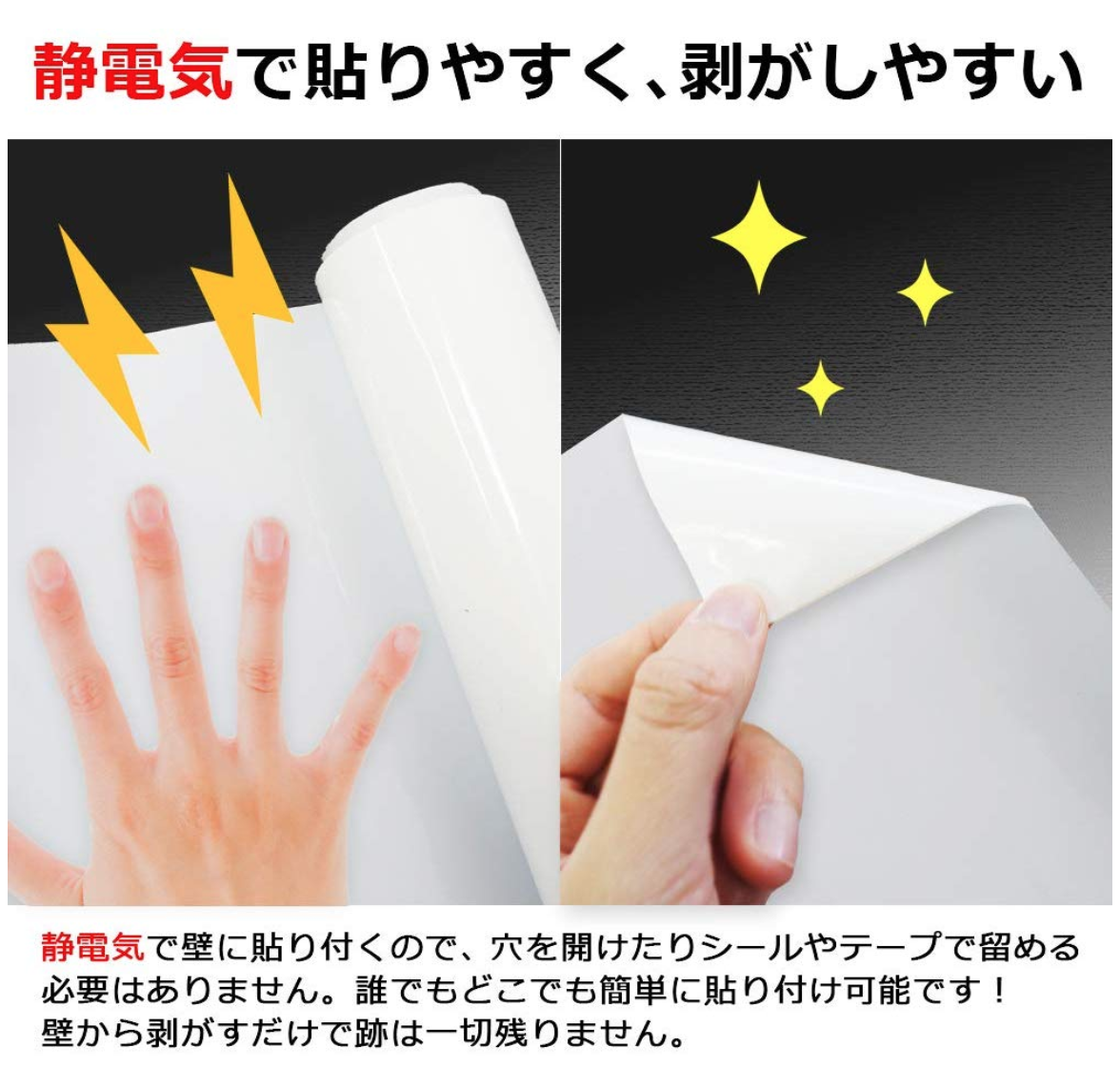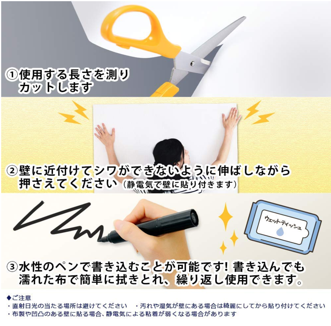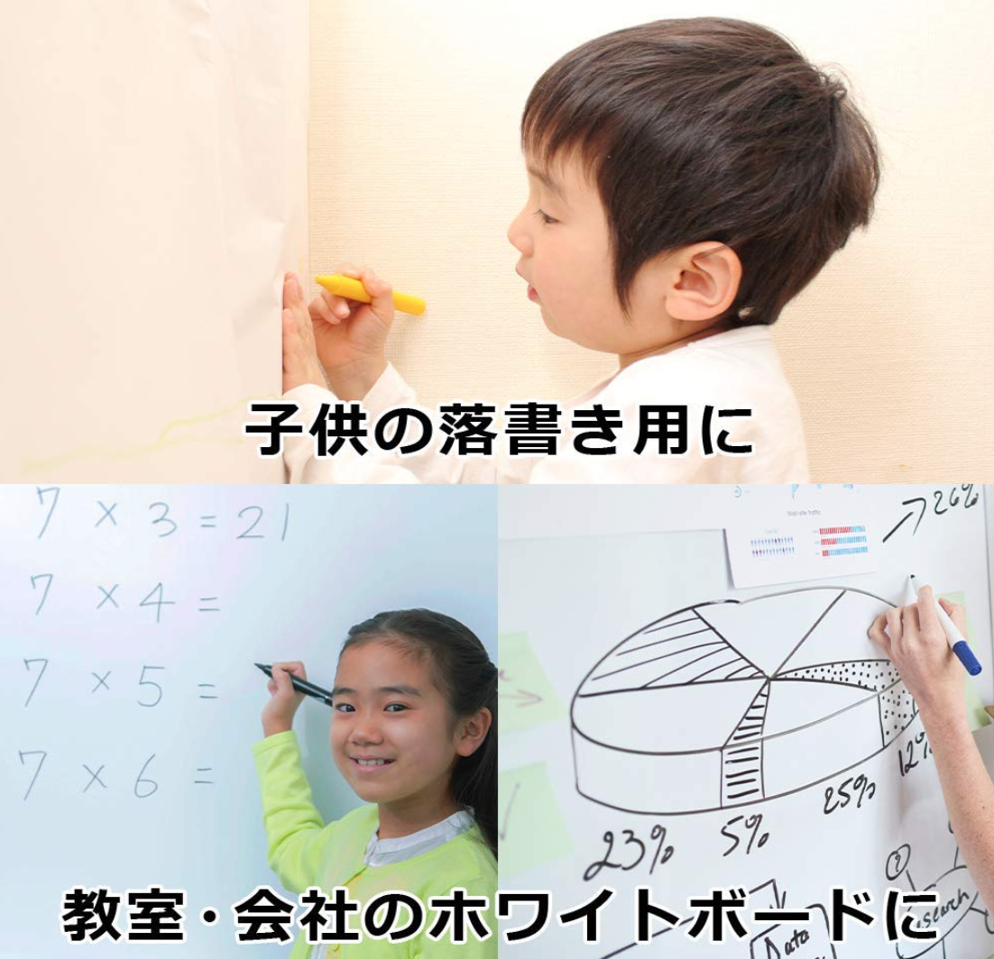 こちらのホワイトボードシートは糊などの粘着ではなく、静電気で壁に貼り付くため、簡単に貼り付けたり剥がしたりすることができます。賃貸のガラスや壁に貼り付けても安心です。また、お好きなサイズにカットして使用することができるため、さまざまな場所で活用いただけます。水性ペンで書き込んでも水拭きで簡単に消すことができます。お子様の落書きにもおすすめな商品です。