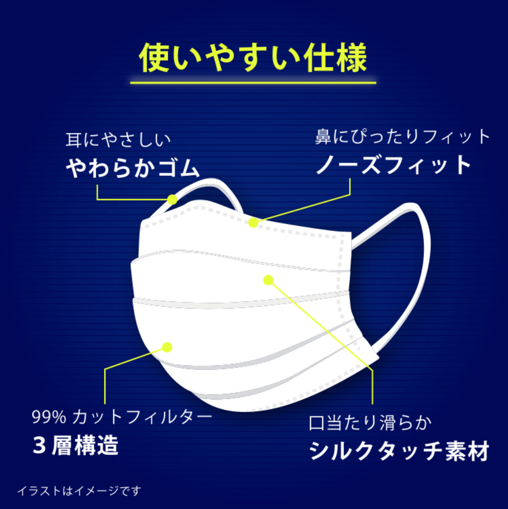 こちらは医療現場から生まれた信頼性抜群のサージカルマスクです。耳が痛くなりにくい柔らかいゴム、鼻にフィットするノーズフィットに加え、マスク内側の素材もシルクタッチ素材を採用し、口当たりが滑らかで快適に着用いただけます。