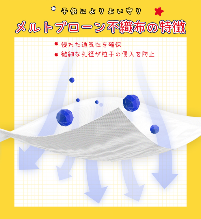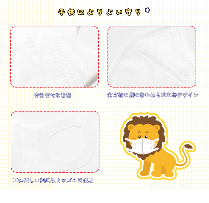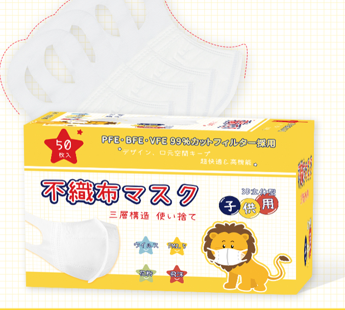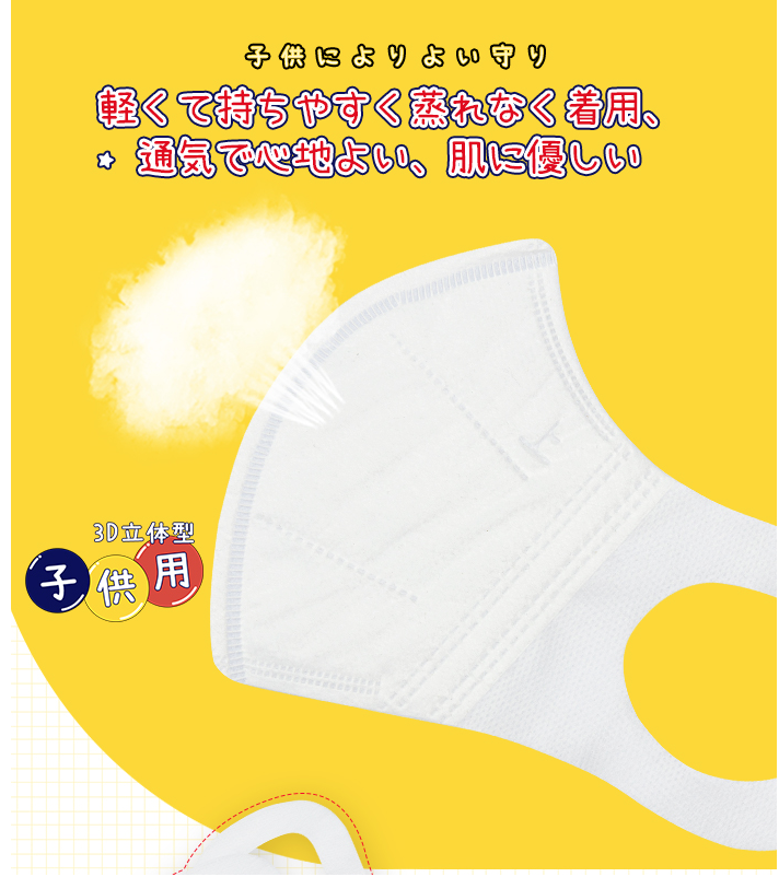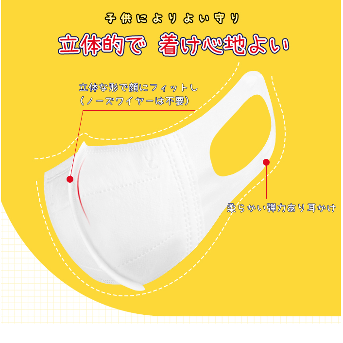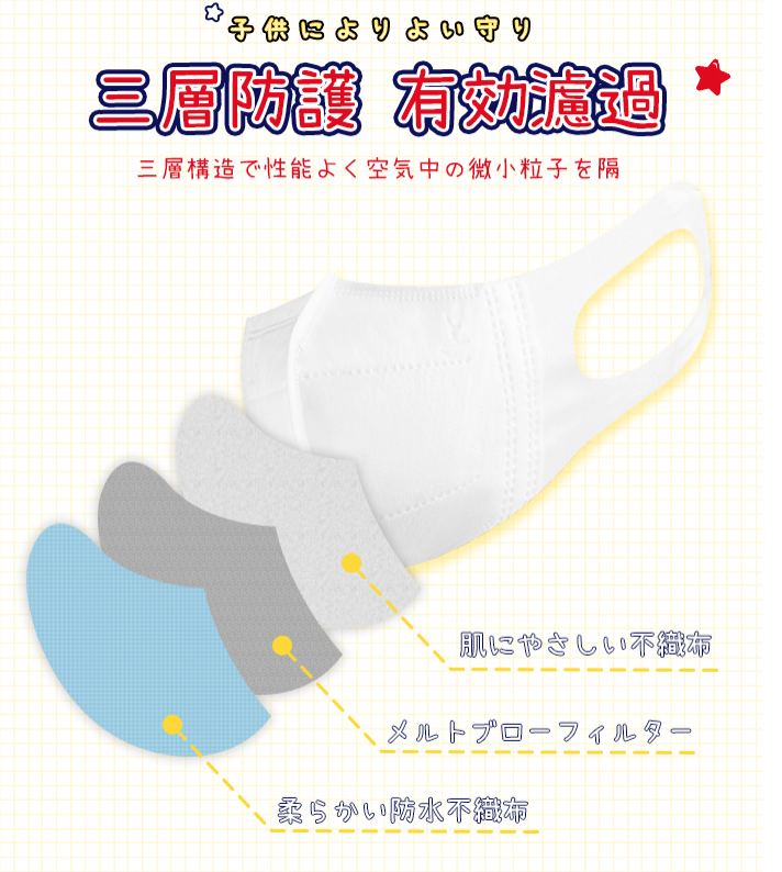 こちらは子供用の3D立体構造のマスクです。飛沫をプロテクトする外カバー、高濾過性と撥水フィルター、抗菌防臭フィルターの3層構造なので、飛沫飛散を防止します。フィット感も高く、耳ひもも痛くなりにくいソフトな素材を使用しているのでお子様も快適に着用いただけます。