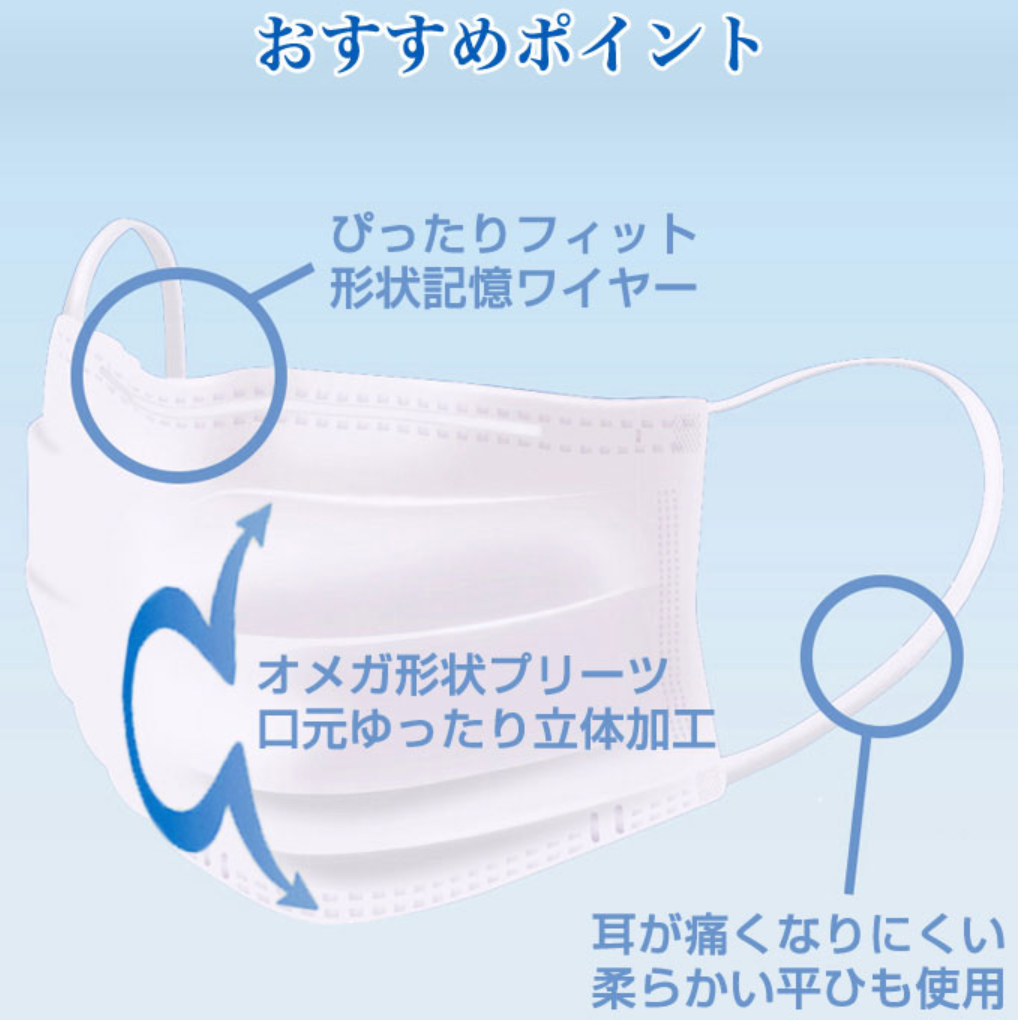 こちらはオメガ形状プリーツを採用し口元の空間が広く、また耳ヒモは平ゴムを採用しているため長時間着用していても耳が痛くなりにくいです。三層構造でウイルスやホコリ、花粉もしっかりブロックします。