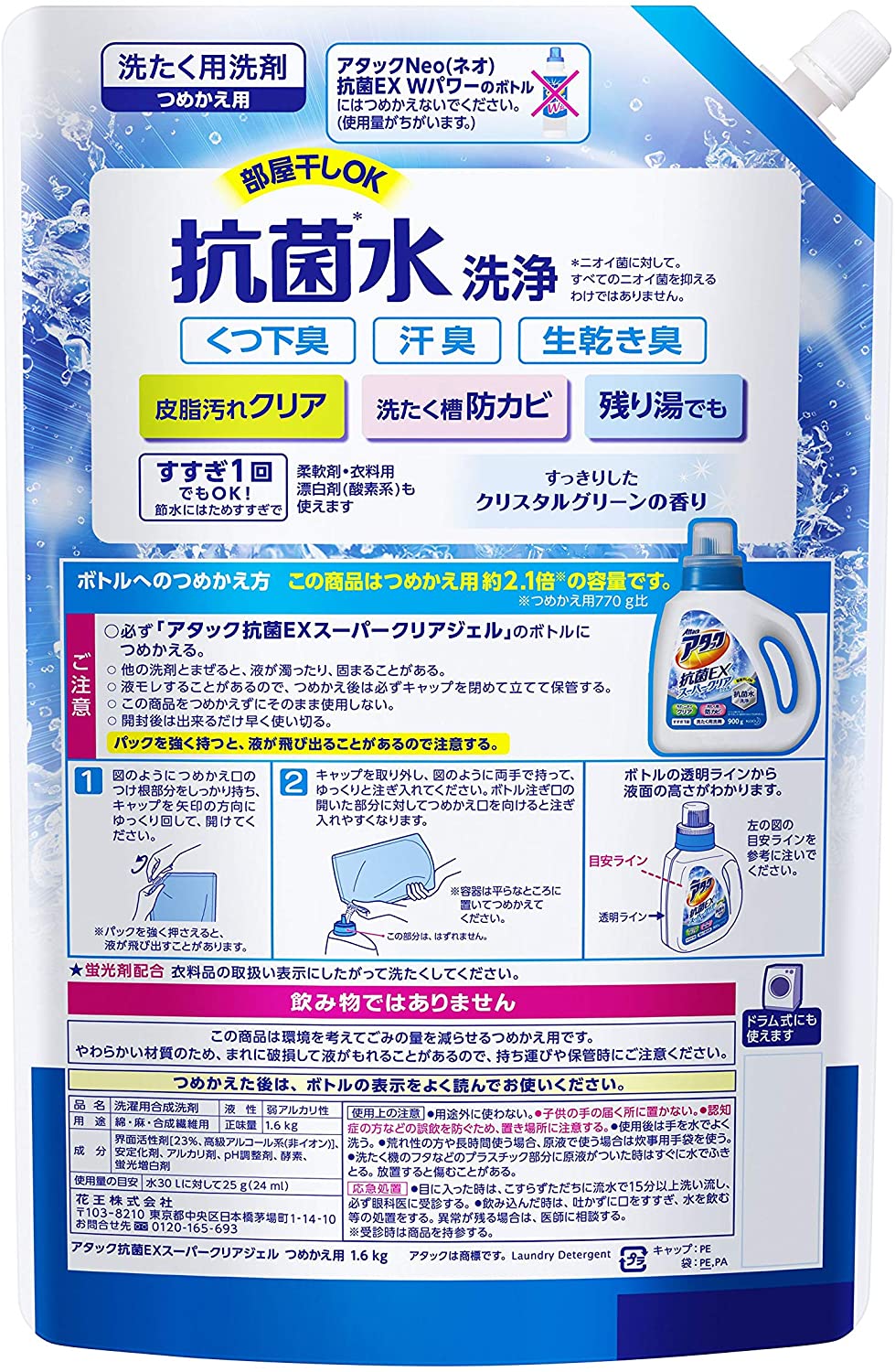 花王 アタック 抗菌EX スーパークリアジェル 詰め替え 1.6Kg×2個