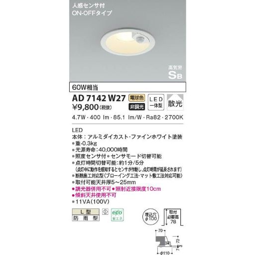 KOIZUMI(コイズミ) LED人感センサー付防雨型ダウンライト AD7142W27