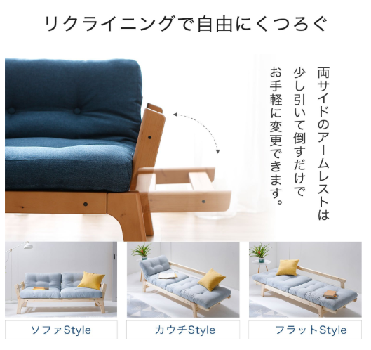 多彩な張地と3色のフレームの組み合わせでお好みのおしゃれなソファーを選べます。お手軽なアームレスト操作は女性でも楽に形を変えることが出来ます。