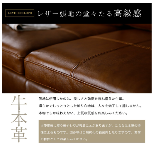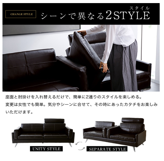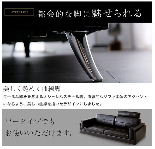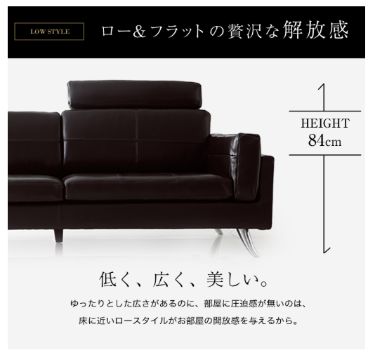 高級感あふれる本革を使用したヴィンテージ風のソファーは、座面や肘掛けを入れ替えてスタイル変更が可能になっています。ロースタイルで圧迫感をあたえないフォルムは、美しく、贅沢な雰囲気を表現。