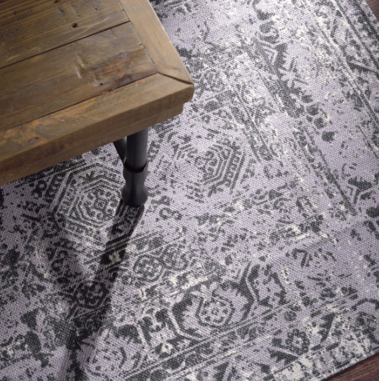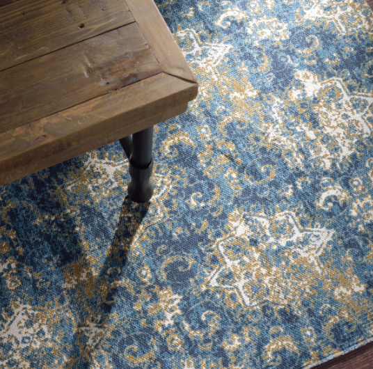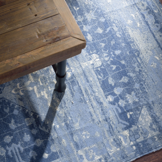 ストーンウォッシュを施したような、模様のかすれがおしゃれなコットンラグマット。オリエンタルブルーの美しいカラーと、アンティークのように使い古したデザインの表現も美しい。
