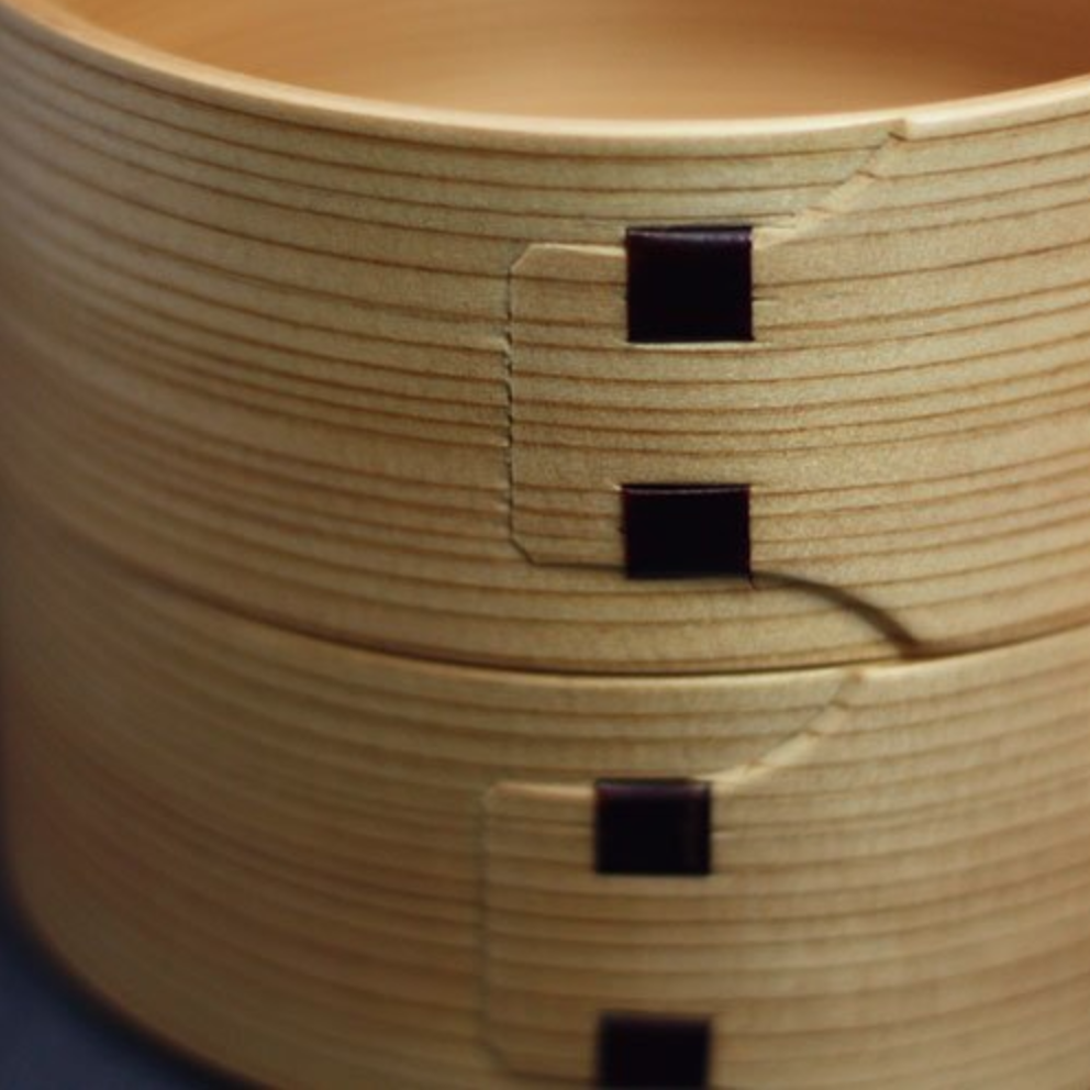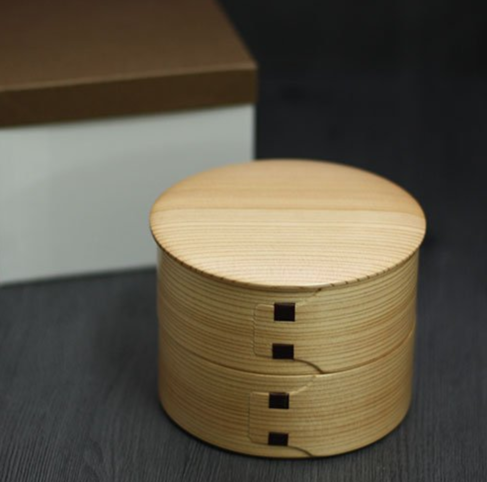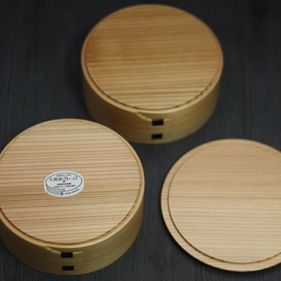 こちらは可愛らしい丸型2段姫子重の弁当箱。通常の曲げわっぱよりはせいろに近い形状ですが、使い勝手はまったく遜色ありません。むしろ、この形状のおかげで、ナチュラル感がより強調されているといえるでしょう。