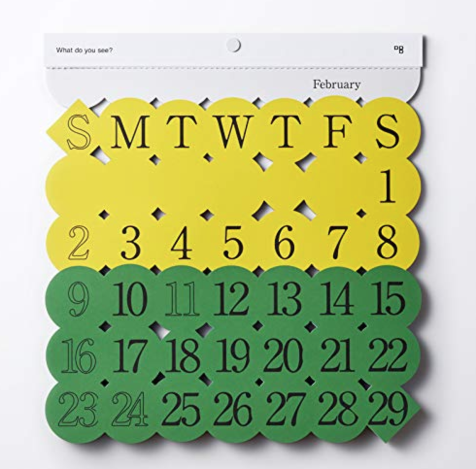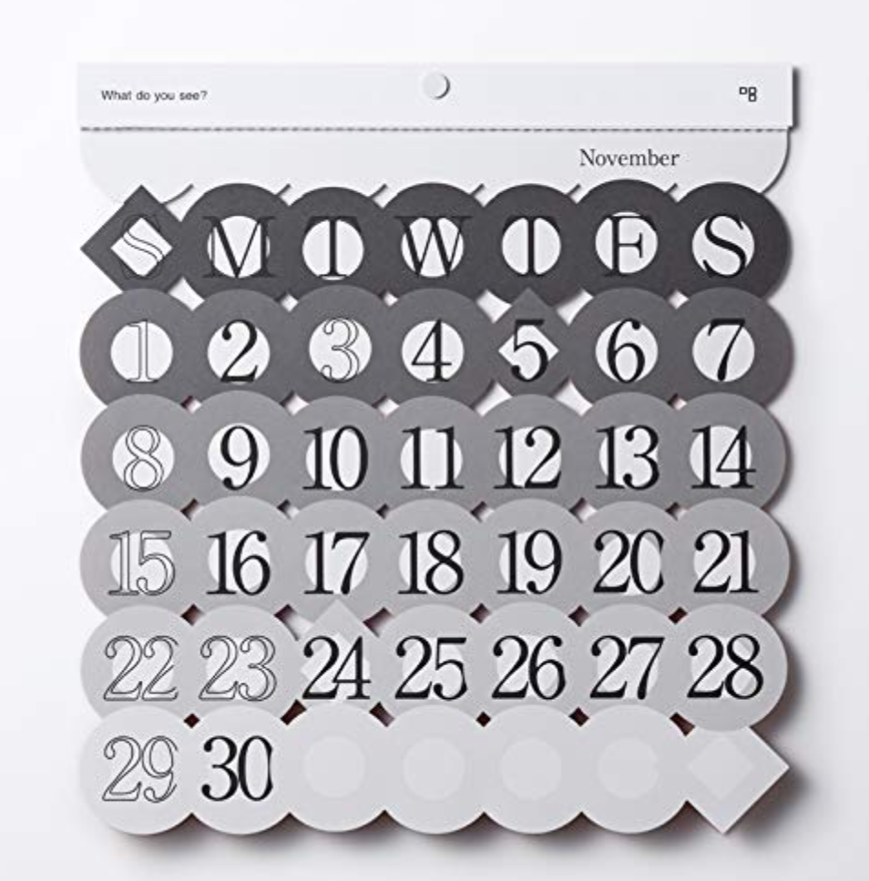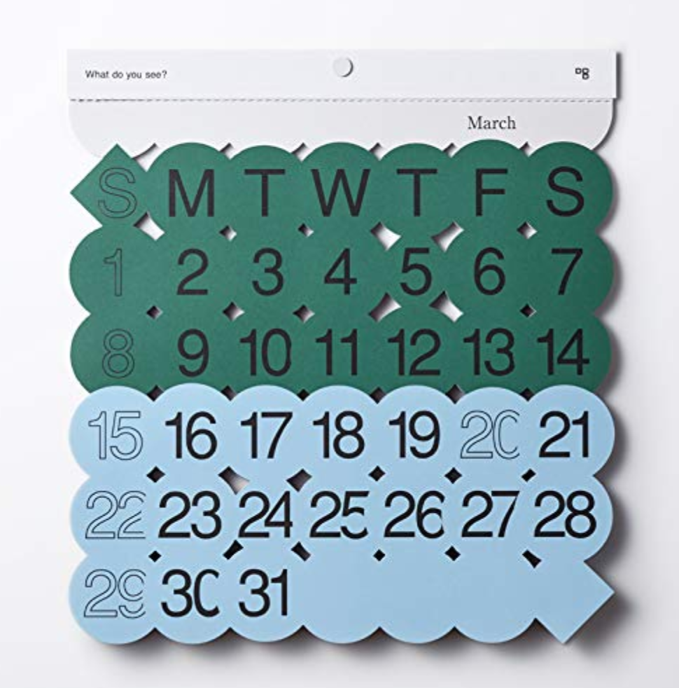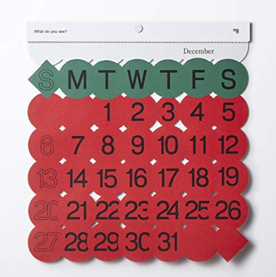 毎月のイメージがデザインされたカラフルなカレンダーです。見る人によってさまざまなものが浮かび上がるので、毎月めくるたびに楽しめます。