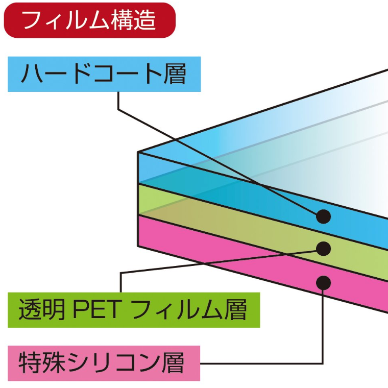 本製品「液晶画面フィルム極」は貼りやすさに加え、三重のフィルム構造で「高透明度」・「気泡吸収」・「指紋防止」を実現した機能的で高品質な液晶フィルムです。